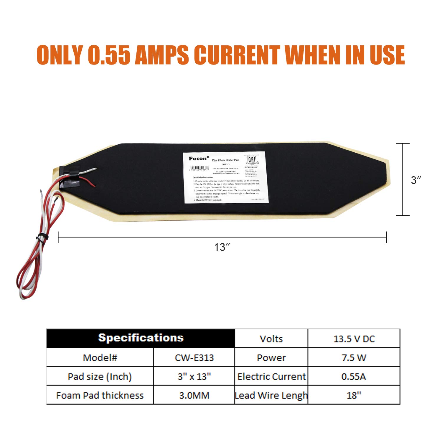 Facon 3" x 13" RV Elbow Pipe Heater Pad, Work for 3" Elbow Pipe, 12V Tank Heater Pad, for RV, Camper, Travel Trailer and Motorhome, DC 12Volts-13.5Volts—