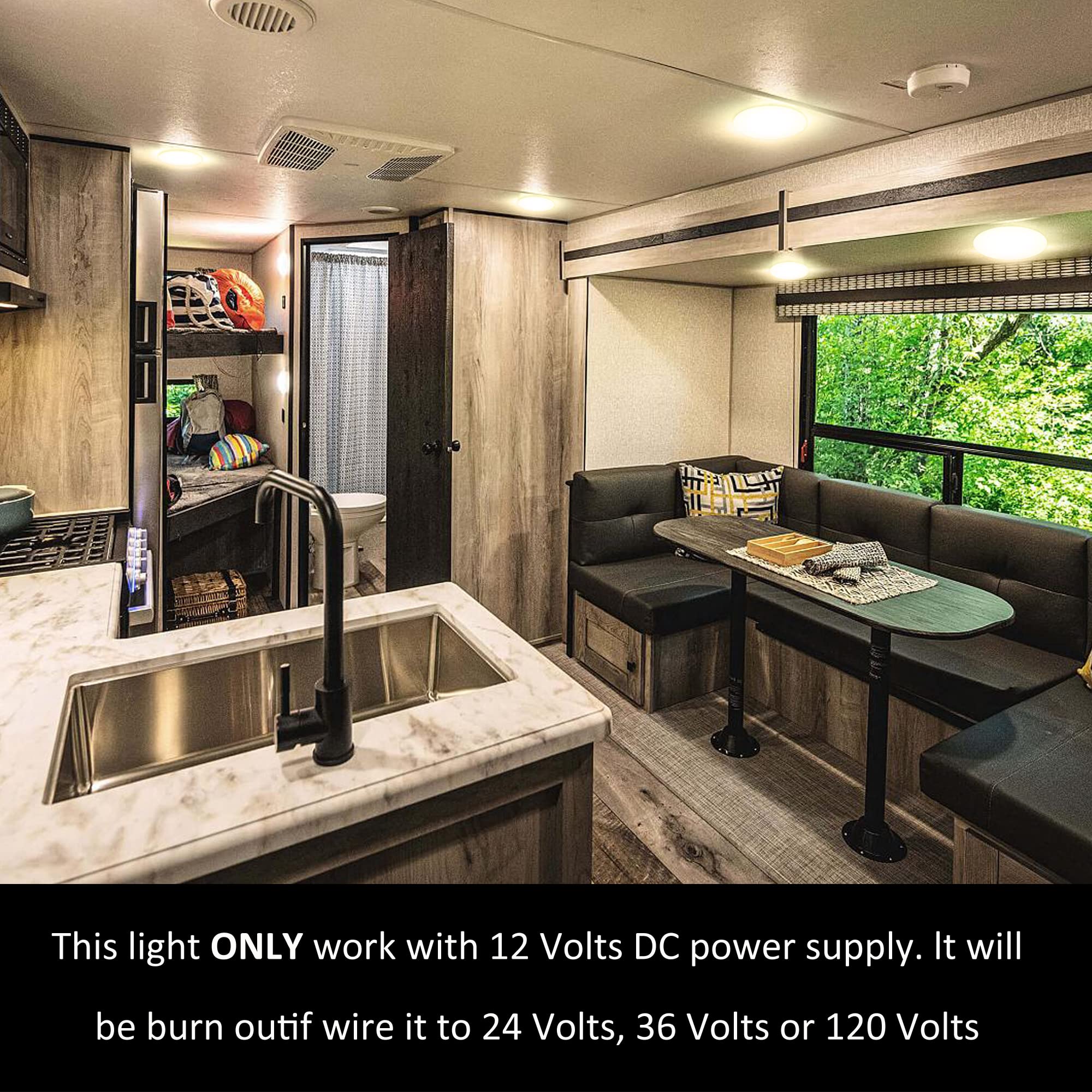 - ă12V RV Interior LightsăDesigned for 12 Volts DC Power. Excellent Recessed Mount led puck Light replacement for RV, Motorhome, Camper, Caravan, Travel Trailer, Boat, Marine. Super slim design just fit narrow place in the RV like under cabinet, bathroom, kitchen. If you use it at home (120volts AC), please wire this fixture to a proper transformer (not included).