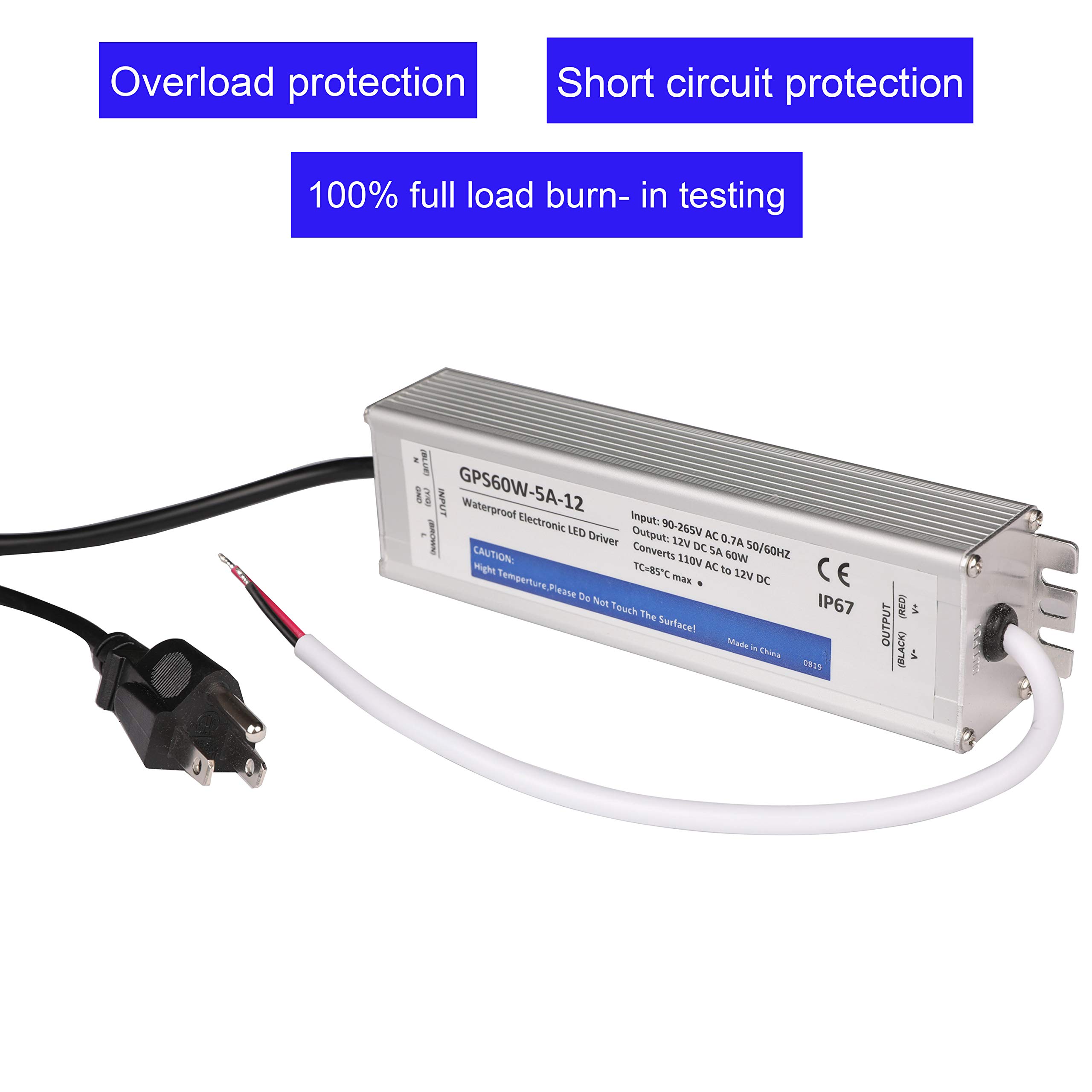 - Input: 110Volts AC 50/60HZ, Output: 12Volts DC 5A 60W. IP67 Waterproof Suitable for Indoor or Outdoor Use